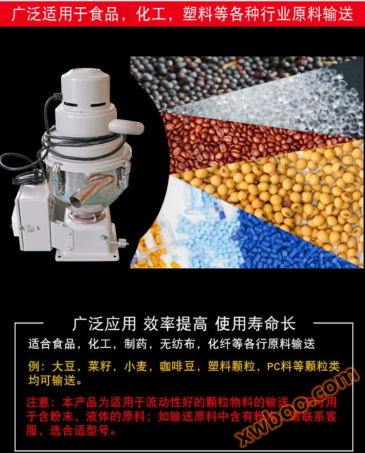 광범위한 응용: 식품, 화학공업, 공업생산, 가정용 흡입재료;사용 가능: 콩, 콩, 채소씨, 밀, 커피콩, 플라스틱 입자, PC 재료 등 입자류를 모두 수송할 수 있다.